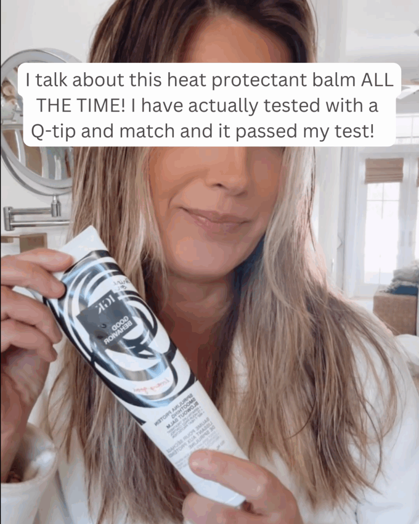I prefer this heat protecting balm to a spray so I’m not breathing in fumes. It also passed my heat test when I applied some to a Q-tip and took a flame to it! Many don’t.