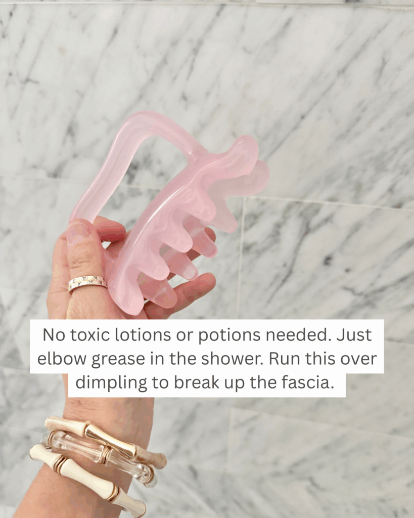 No toxic lotions or potions needed. Just elbow grease in the shower. Run this over dimpling to break up the fascia.