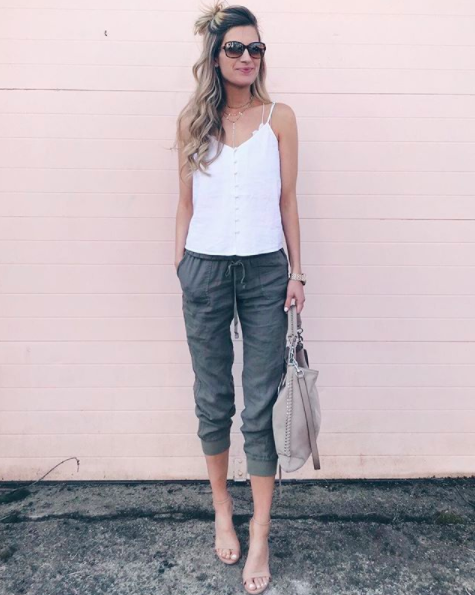 One the best all-around ways to style joggers is for weekend casual wear. You can throw them on with a cami and sneakers and you’re good to go. If you want to dress it up a little, maybe you’re meeting the girls for brunch, then throw on a cute pair of wedges. The right shoe can instantly take joggers from casual to a little more dressed up. And, because jogger style pants are slim at the ankle you can get away with wearing almost any kind of shoe.